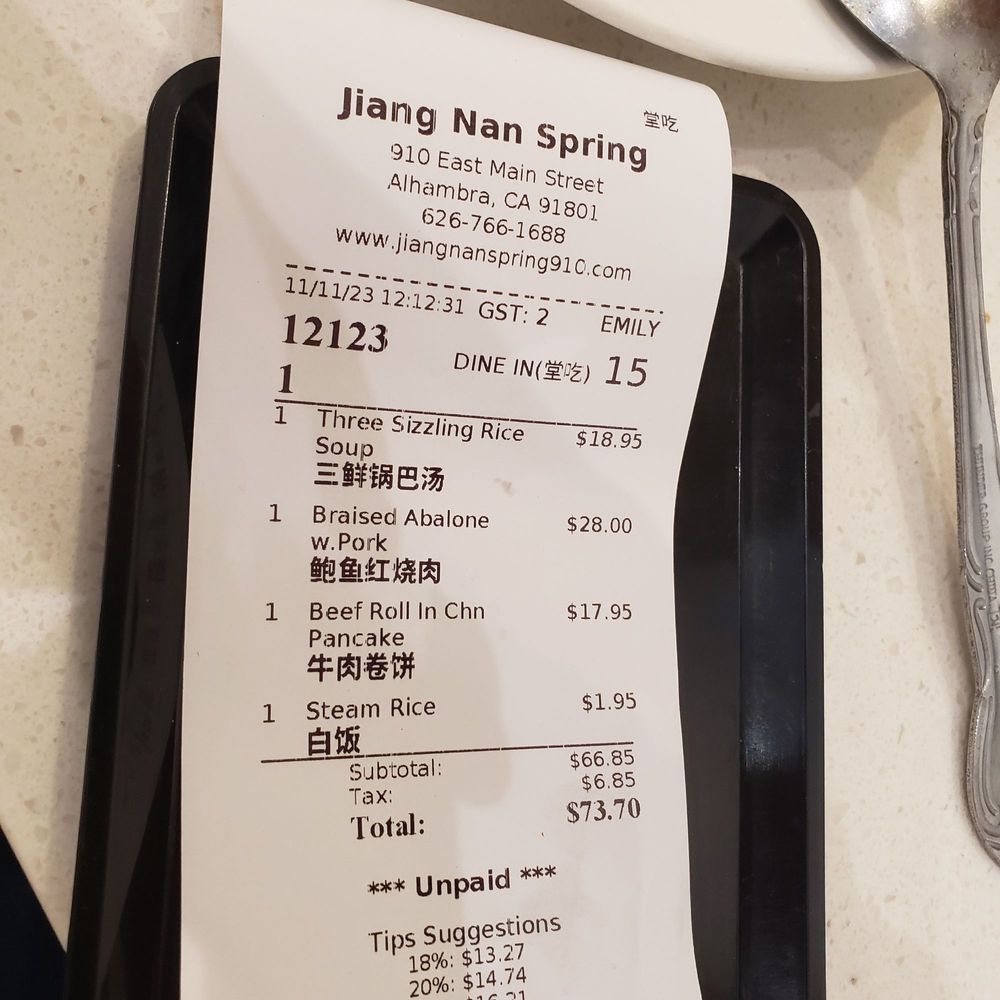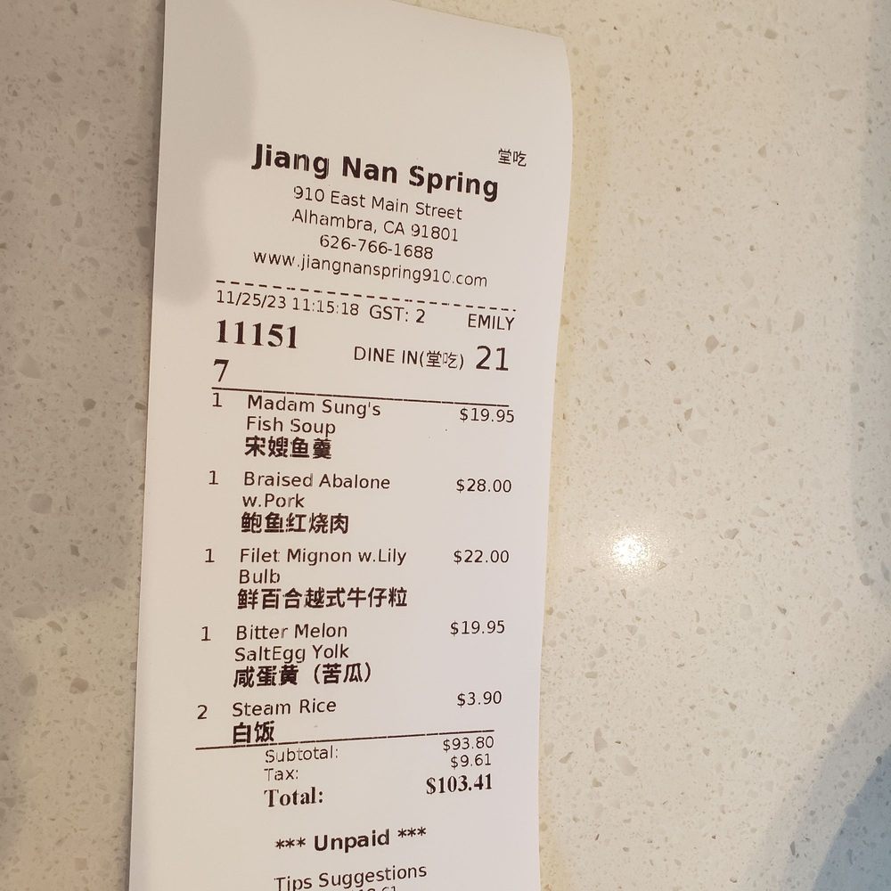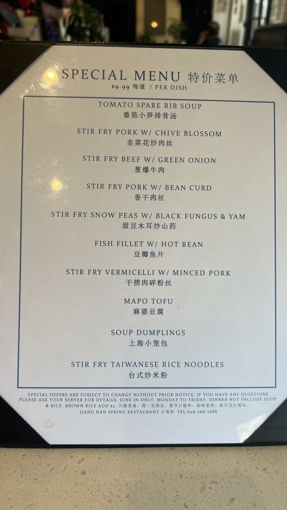 Located in Alhambra, CA, Jiang Nan Spring is a Chinese restaurant offering a wide range of dishes with a focus on Shanghainese cuisine. The menu features a variety of options including chicken, fresh fish, in-house made noodle dishes, mussels, traditional rice dishes, and more. Known for their superb cuisine, Jiang Nan Spring has earned a Michelin Bib Gourmand rating. Customers rave about the generous portion sizes and the attentive service provided by the friendly staff. Highlights of the menu include the dungeness crab with rice cake, seaweed fried fish, loofa with dried shrimp, and pork and bamboo soup. With a cozy ambiance and knowledgeable servers, Jiang Nan Spring is a top choice for those seeking authentic and delicious Chinese cuisine in the area.